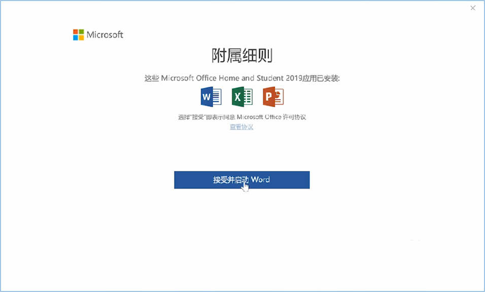 5、稍等一段時間后,顯示“Office即將就緒”,點擊“接受并啟動XXX”(如下圖示例的是在 Word 中激活,點擊“接受并啟動Word”)。