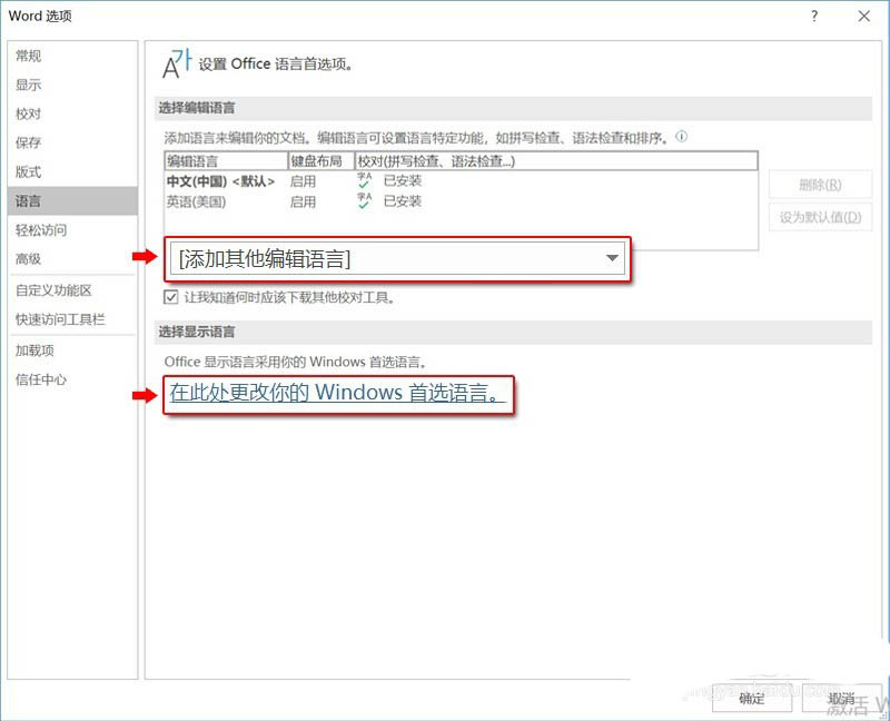 打開任意一個 Office 文檔,以 Word 文檔 為例,點擊“文件 > 選項 > 語言”。在選擇編輯語言中,可以添加其他編輯語言。在選擇顯示語言中,點擊“在此處更改你的 Windows 首選語言”或“在此處更改設置”,通過更改 Windows 首選的語言來更改 Office 的顯示語言。