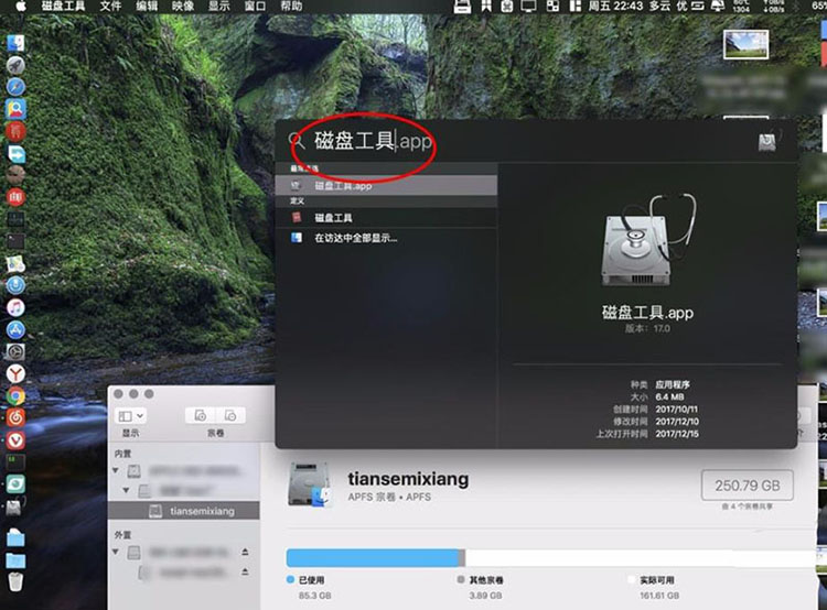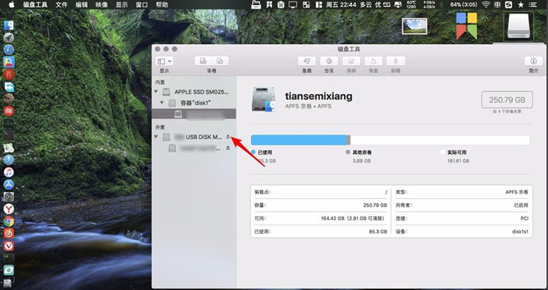 2、此外還可以先按鍵盤上面的cmmand+space,輸入磁盤工具按回車鍵進入磁盤工具,在圖二在外置這里點擊usb這里,同樣可以推出外置的硬盤或者U盤。這個方法適合無法推出的磁盤圖標。