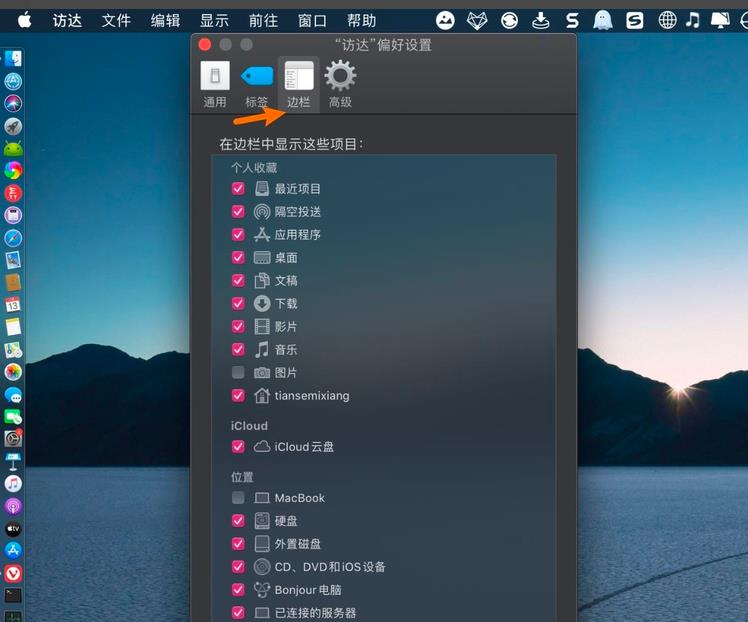 5、點擊偏好設置,點擊【邊欄】。