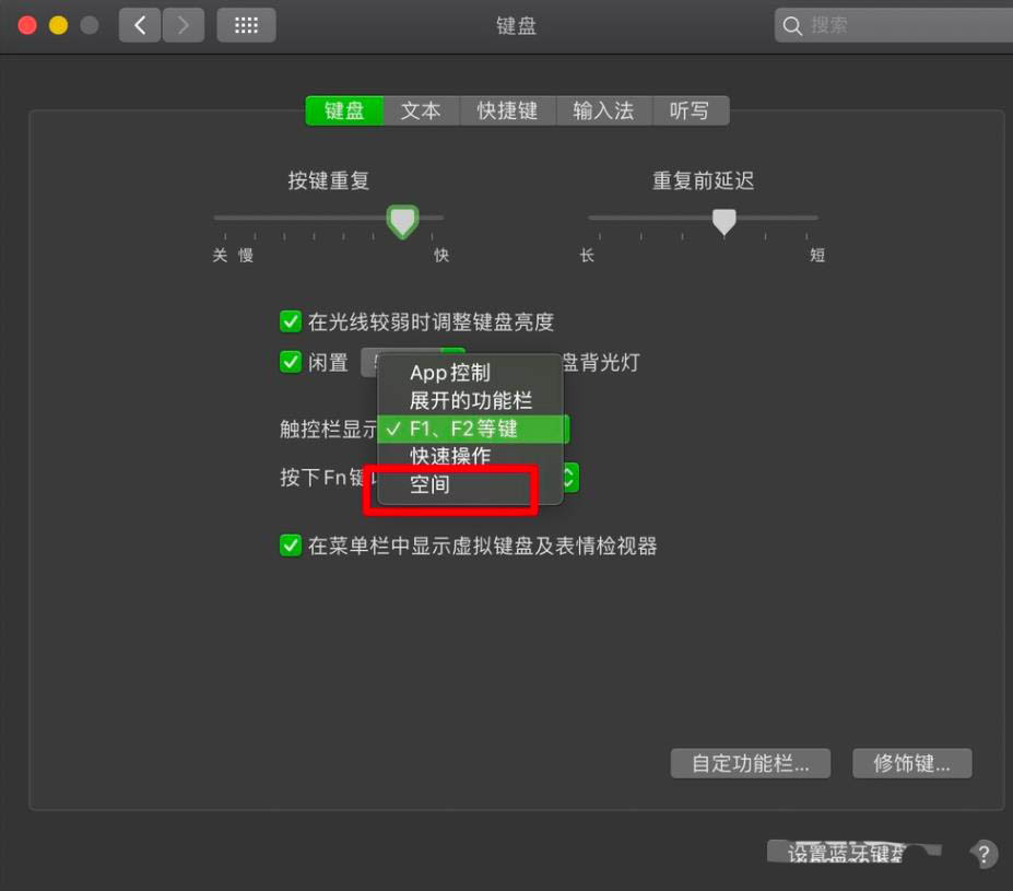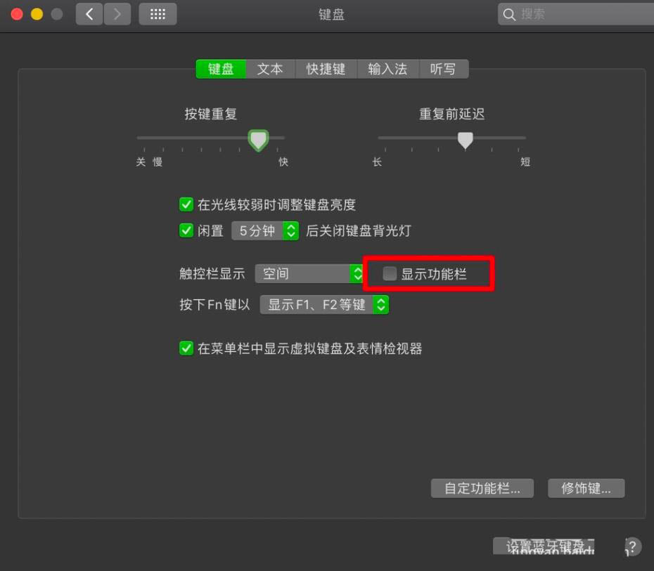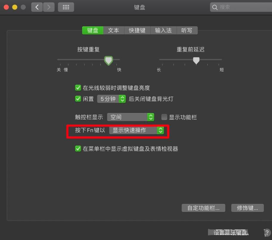 5、按下fn鍵這里,選顯示快速操作即可,如下。那么觸控欄功能欄,就關(guān)閉了。