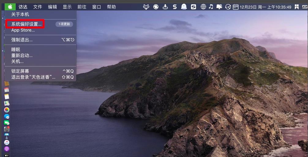 1、如圖一,打開(kāi)蘋(píng)果,如圖二,點(diǎn)擊系統(tǒng)偏好設(shè)置。