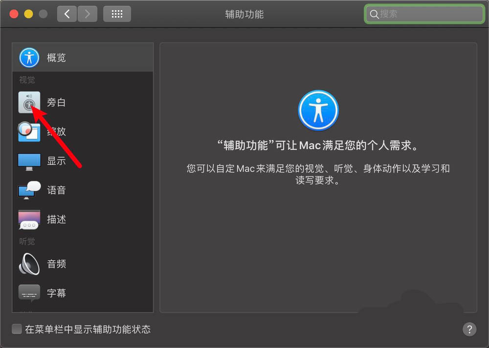 4、輔助功能,點擊左邊旁白,如圖。