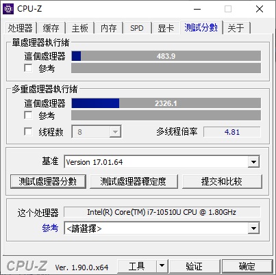 接下來是CPU-Z Benchmark,英特爾酷睿i7-10510U同樣取得單線程483.9分、多線程2326.1分的成績。雖然這個跑分不是很穩定,但英特爾酷睿i7-10510U這個分數依然不錯。