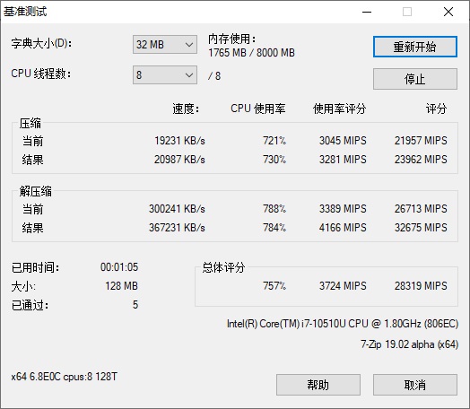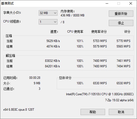 而在對性能壓榨比較厲害的7zip中,單線程總分為6530MIPS,多線程總分為28319MIPS。