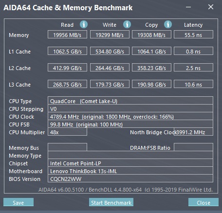 此外我們也測試了英特爾酷睿i7-10510U的內存與緩存性能,內存性能表現一般,尚可接受,延遲不高,結果如下圖所示。