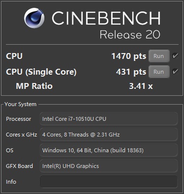 英特爾酷睿i7-10510U在測試中去的4325分的成績,還是比較令人驚喜的,說明處理器有著不錯的渲染能力。