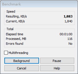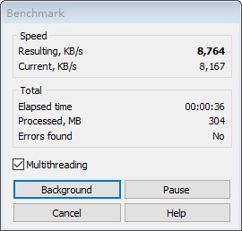接下來我們對處理器的壓縮解壓性能進行測試,在WinRAR中,單線程速度為1883 KB/s,多線程速度為8764 KB/s。