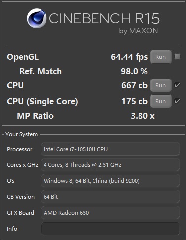 首先是渲染測試,在Cinebench R15和R20中,英特爾酷睿i7-10510U表現不錯,R15單核成績為175cb,多核成績為667cb。