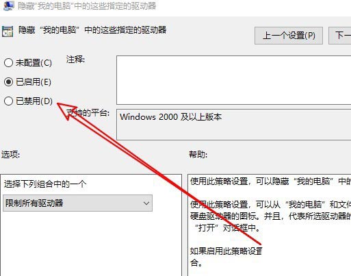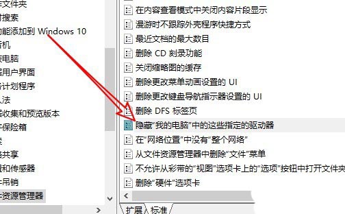 3、接下來在右側(cè)的窗口中找到“隱藏我的電腦中的這些指下的驅(qū)動器”設(shè)置項。