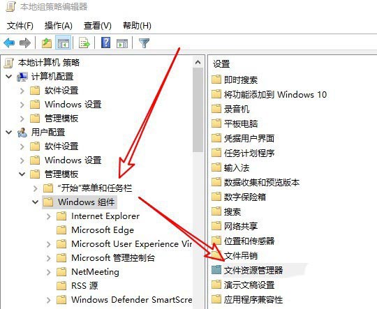 2、然后在打開的本地組策略編輯器窗口中依次點擊“用戶配置/管理模板/Windows組件”的菜單項,然后點擊右側(cè)的“文件資源管理器”的文件夾。