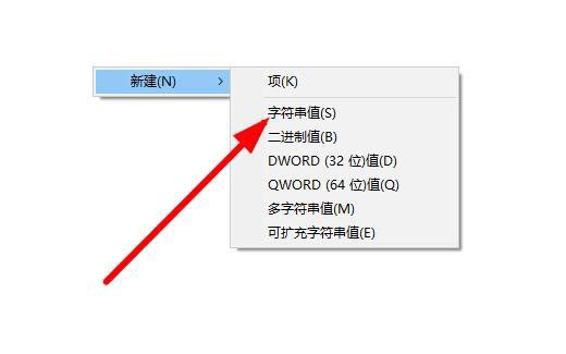 4、右側的窗口右鍵點擊空白位置,在彈出菜單中依次點擊“新建/字符串值”的菜單項。