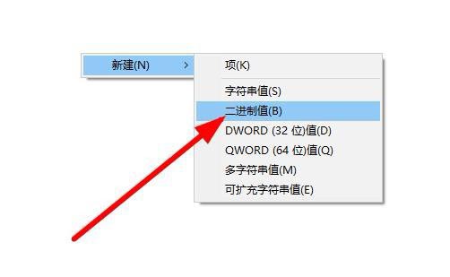 4、在右側窗口的空白位置點擊右鍵,在彈出菜單中選擇“二進制值”的菜單項。