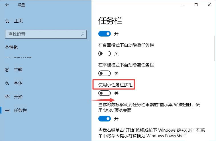 5、然后將使用小任務欄按鈕的開關向右滑動。