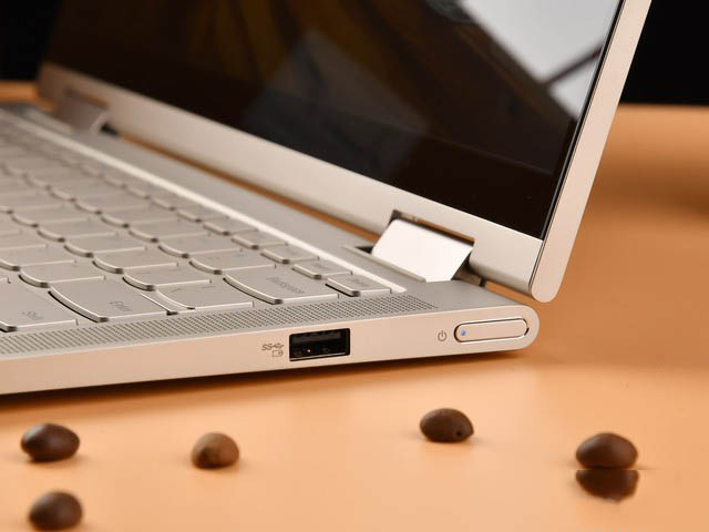 再來看看YOGA C740這邊,它采用的是YOGA最為經典的360°轉軸設計,不支持單手開合。現在看來這個設計是有利于壓低整機制造成本的,但筆者還是認為如果能采用上一代的表鏈式轉軸會更加有吸引力。