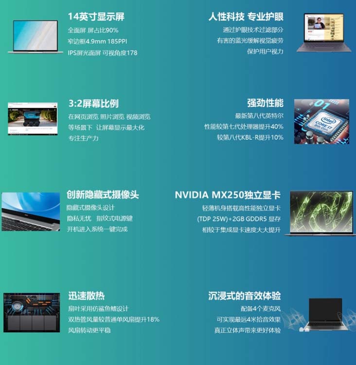 Matebook 13 全面屏:屏占比88%,3:2屏幕比例,左右窄邊框4.4mm