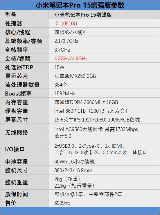 除了處理器之外,小米筆記本Pro 15增強版還做了如下升級: