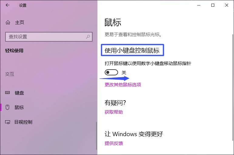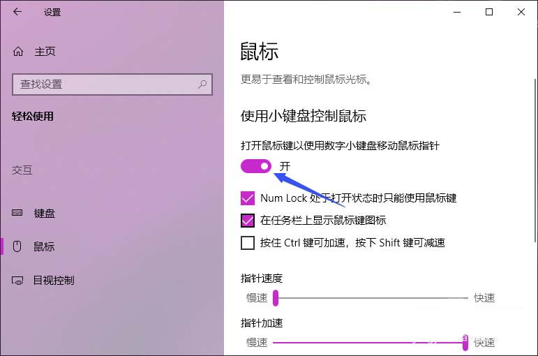 5、將使用小鍵盤控制鼠標(biāo)的開關(guān)向右滑動打開即可。