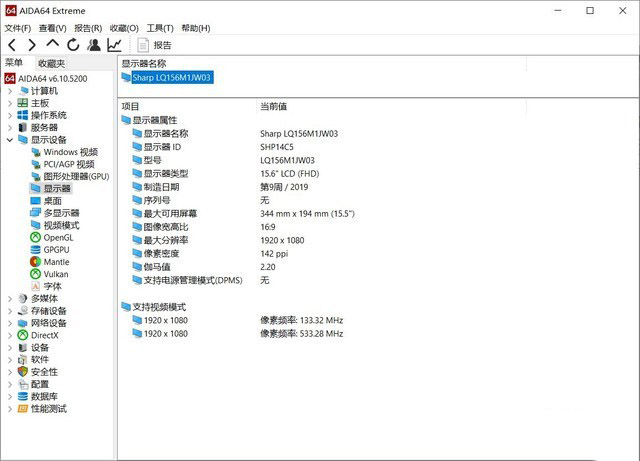 經(jīng)檢測,這塊屏幕來自夏普,型號是LQ156M1JW03,屏庫中有這塊屏幕的詳細(xì)參數(shù),除了240Hz刷新率以外,它還擁有100%sRGB、71%NTSC、74%AdobeRGB的色域。