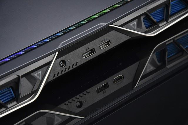 首先是左側(cè),可以看到寬大的出風(fēng)口鰭片被噴涂成了掠奪者的主題藍(lán)色,出風(fēng)口的右側(cè)則是一個(gè)RJ45網(wǎng)線接口和兩個(gè)支持關(guān)機(jī)充電的USB 3.1gen2接口,再往右還有3.5mm麥克風(fēng)接口與耳機(jī)接口。
