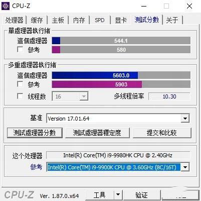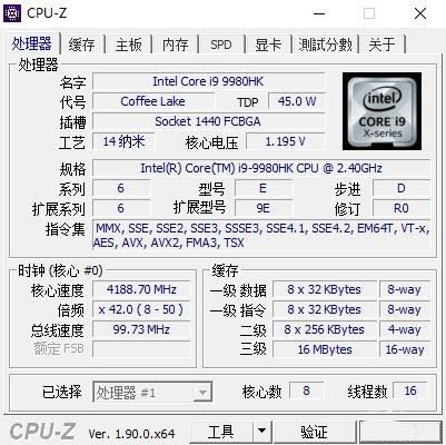 在CPU-Z測試中可以看到與桌面i9-9900K的對比,可以看出二者已經(jīng)非常的接近了,差異大約在5%左右,如果i9-9980HK處理器解鎖倍頻限制的話二者就能夠達(dá)到同樣水平了。