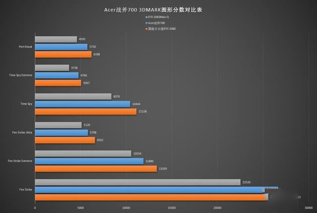 雖然戰(zhàn)斧700所采用的RTX2080為標(biāo)準(zhǔn)版,核心頻率與顯存頻率會(huì)比移動(dòng)端Max-Q版本更高,但還是會(huì)低于桌面版顯卡。為了能夠讓大家直觀的了解戰(zhàn)斧700的性能水平,我們找來桌面頂級(jí)非公版RTX2080與移動(dòng)版RTX2080Max-Q的測試成績做對比。