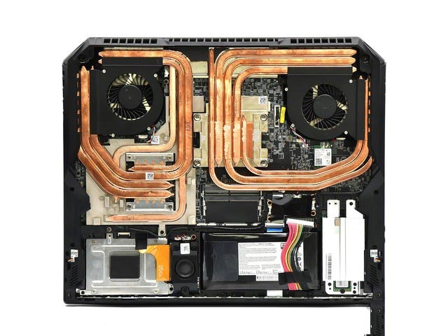 微星GT76 Titan之所以能夠將i9-9900K穩定壓制和它強大的散熱系統有很大關系,GT76 Titan采用了4風扇+11銅管的超豪華散熱模組,其中處理器有5根銅管覆蓋,顯卡有6根,并且在周圍的供電、顯存部分也都通過均熱板進行了覆蓋。除此之外,GT76 Titan在散熱鰭片的厚度以及左右兩個風扇的尺寸上也相當可觀。