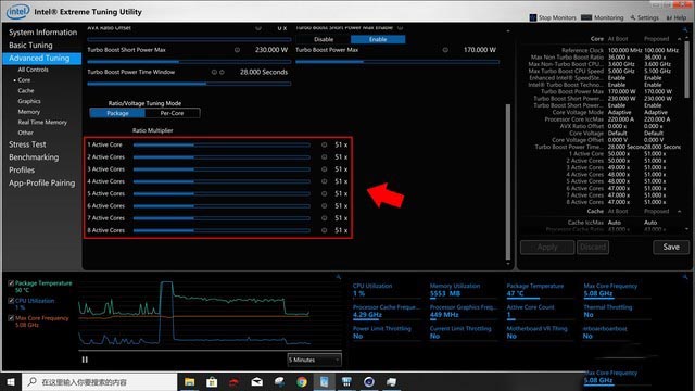 之后我們用XTU(Intel Extreme Tuning Utility)對處理器進行了超頻,最終在不改變電壓、功耗的情況下將i9-9900K超到了全核5.1GHz(倍頻51),此時Cinebench R15的分數為單核220、多核2090cb,單、多核相比默認狀態下分別提升了8%和3%。