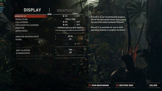 測試時,我們的畫質(zhì)設置為:1920×1080、開啟DX12、關閉垂直同步、使用系統(tǒng)內(nèi)置的最高畫質(zhì)。