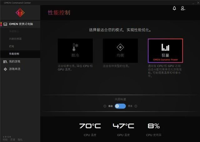 惠普暗影精靈5 Air主打纖薄化,但是卻依然可以在狂暴性能模式下運行,從中可以看出惠普在散熱設計方面的自信,打開OMEN Command Center,在性能控制菜單里找到“狂暴”模式按鈕,打開之后就可以讓CPU和GPU處于最佳性能狀態(tài)。