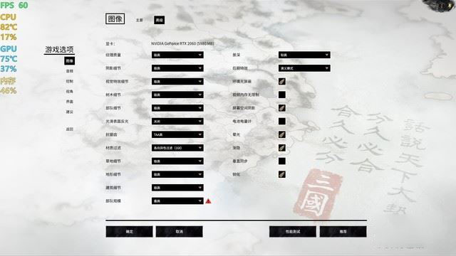 在測試時,我選擇了游戲的最高畫質(zhì),分辨率依舊為1920×1080,同時我開啟了這款游戲最吃性能的部分,就是下圖中最下方右側(cè)有一個紅色三角標志的選項——部隊數(shù)量。該選項調(diào)整到最高之后,CPU和GPU將迎來“地獄級”的考驗。
