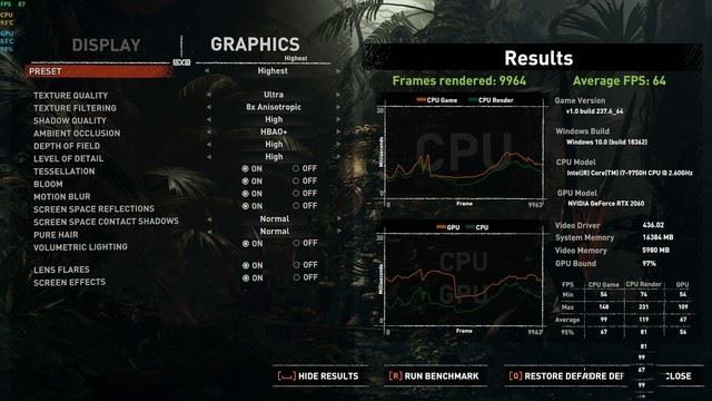 《古墓麗影:暗影》的Benchmark部分選用了多個場景進行測試,能夠比較客觀的反映出硬件配置運行這款游戲的實際表現(xiàn)。在開啟光線追蹤的狀態(tài)下,最終得到平均幀數(shù)64幀的結(jié)果,在游戲本中屬于中等偏上的結(jié)果。