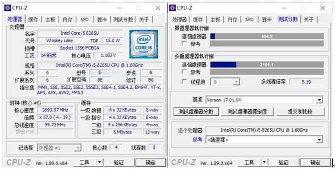 我們?cè)u(píng)測(cè)的這款ThinkBook 13s筆記本搭載了第八代Intel Core i5-8265U處理器,Whiskey Lake架構(gòu),14nm工藝,4核8線程,單核睿頻3.90 GHz,TDP15W,集成Intel UHD Graphics 620顯卡。這款處理器主要的優(yōu)勢(shì)就是低功耗,并且對(duì)散熱的需求較低,意味著可以為移動(dòng)設(shè)備帶來更長(zhǎng)的續(xù)航時(shí)間,以及均衡而穩(wěn)定的性能表現(xiàn)。CPU-Z測(cè)試多核得分2101,單核得分404。