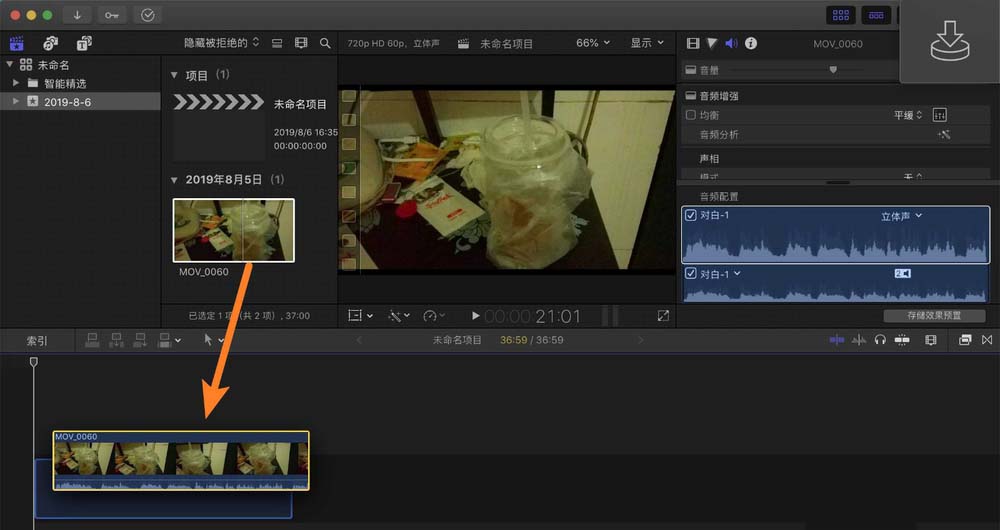 4、把視頻拖入時間線,點擊右邊的聲道。