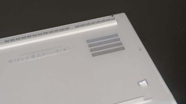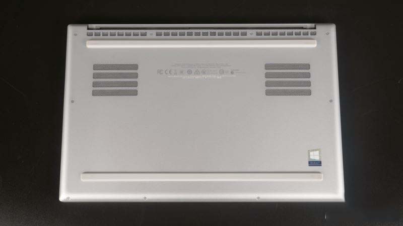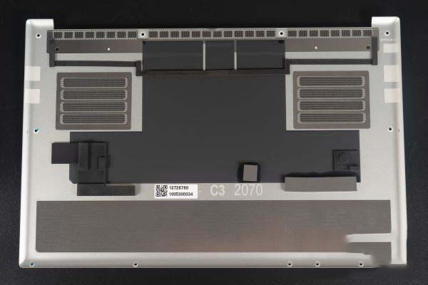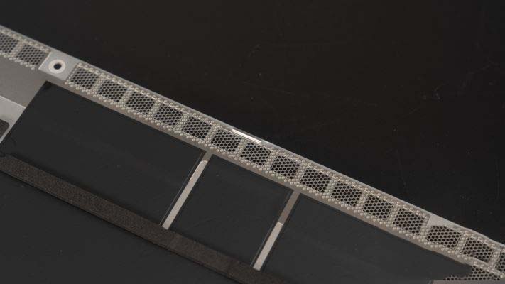 機器下方是一塊長條的80瓦時電池,提供了不錯的續航。上方的兩個內存插槽都已安裝8GB的內存,組成雙通道16GB。內存左側是M.2 SSD,似乎整個機器只有這一條插槽,無法進一步擴展。右側是英特爾的AX-200網卡。由于這款筆記本揚聲器是朝上發聲,因此從背面只能看到兩邊兩塊塑料,看不到音箱單元本身。