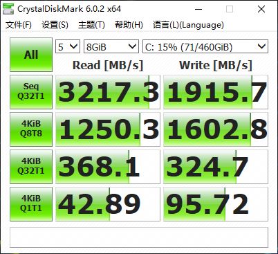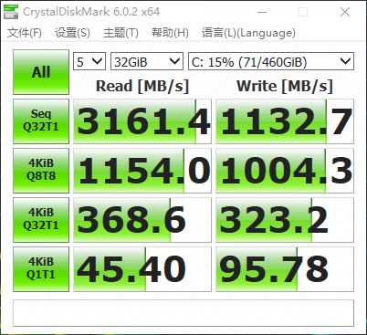 使用CrystalDiskMark實測下來連續讀取速度超過了3200MB/s,連續寫入超過了1900MB/s,都超過了標稱值。而在進行32GB測試中,寫入速度出現了大幅下降,這是因為耗盡了SLC緩存造成的。