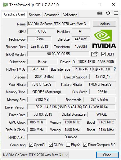 雷蛇靈刃15水銀版搭載了RTX 2070 Max-Q,Max-Q意味著它的TDP會比標準版要低一些,頻率也因此更低。我們評測時將驅動更新至最新的431.36。
