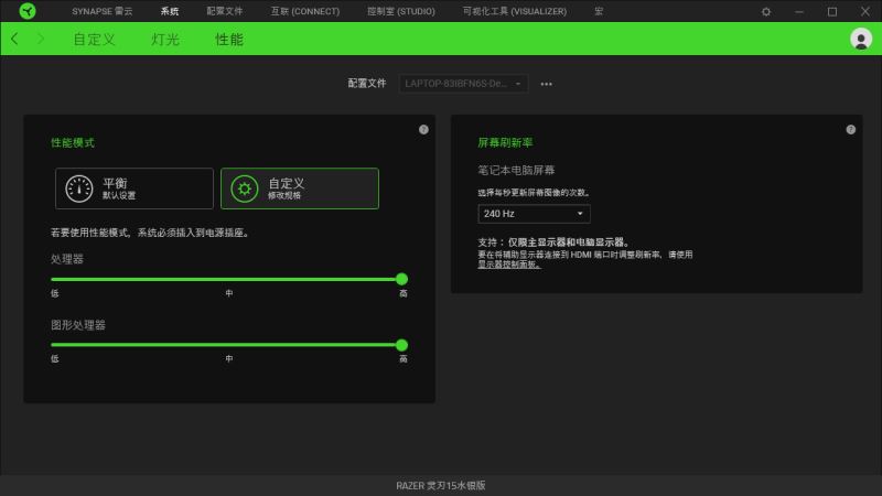 在雷蛇控制中心中可以調節機器的性能模式,默認是平衡模式,想要獲得更好的性能可以選擇自定義模式然后將處理器和圖形處理器的滑塊均調至最高,本次評測我們的“高性能模式”就是指將這種設定。