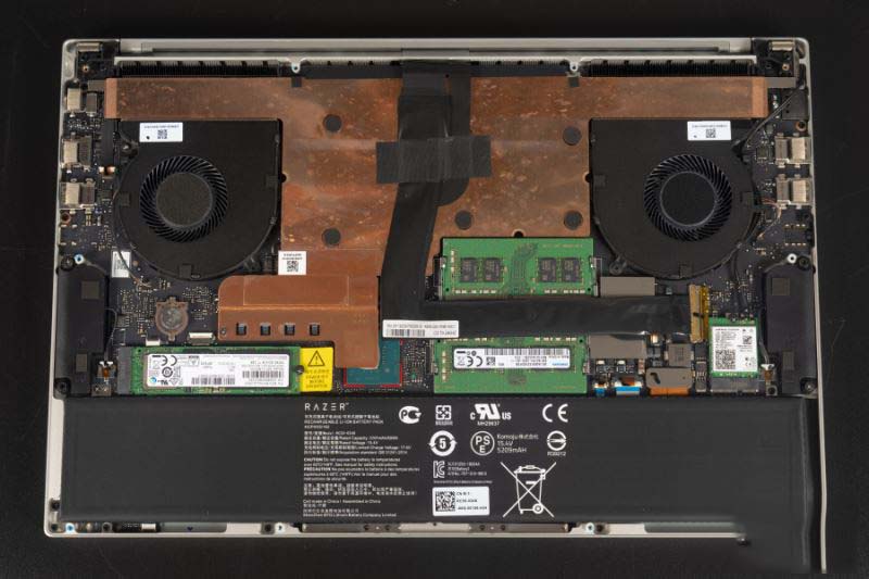 雷蛇靈刃15水銀版內部最矚目的就是沒有采用一般的熱管散熱,而是采用了一體式的真空均熱板,散熱效率進一步提升,散熱填充物也從硅脂更換為了服務器級石墨散熱材料。均熱板的面積很大,除了CPU和GPU,顯存、供電,還有PCH芯片都照顧到了。左右使用了2個44扇葉的風扇,配合2個68片0.1mm的鰭片迅速將熱量帶走。屏幕的排線從均熱板上方走過,想要進一步拆機一定要先將其斷開。