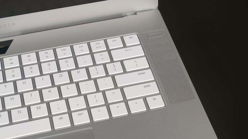 不同于大多數游戲本,雷蛇靈刃15水銀版的揚聲器位于鍵盤兩側向上出聲,而不是位于D面,這樣的好處是筆記本放在大腿上時音量不會變小,但日常使用時要注意避免異物進入揚聲器開孔。開機鍵被隱藏在了右側揚聲器開孔的上端,隱蔽性有點太好了,讓人有時一下子找不到。