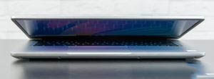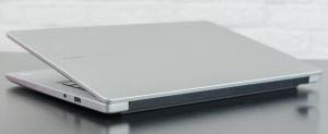 從側面看筆記本的厚度也適中,最厚處比一枚一元硬幣直徑小一些,為17.95mm。整體筆記本三圍為323mm*228mm*17.95mm。同樣筆記本的正面及后面都沒有散熱孔或接口,屏幕轉軸為黑色塑料材質。
