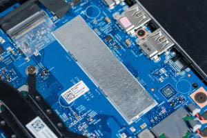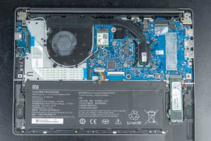 RedmiBook 14的D面打開比較方便,將后面的9枚螺絲擰下后用撥片就可以拆下了。去掉后蓋就可以看到RedmiBook 14的主板及電池了。而電池占據了筆記本下方比較大的空間。散熱器在右上方,單風扇散熱,風扇直徑為5厘米。但熱管串聯為CPU和GPU進行散熱,同時在GPU附近的顯存上也有金屬散熱片覆蓋輔助散熱。