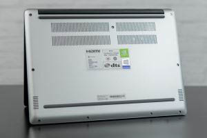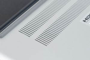 D面的金屬后蓋上方的散熱孔面積比較大, 能滿足RedmiBook 14的散熱需求。而C面貼紙少是因為更多的貼紙被貼到了D面。同時從D面也可以看到RedmiBook 14的揚聲器在D面。D面上下有防滑條,而且筆記本轉軸附近的防滑條要比筆記本前部的要高一些,所以可以墊起筆記本有利于散熱。