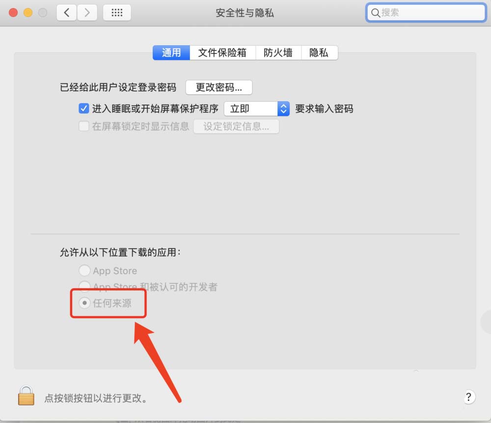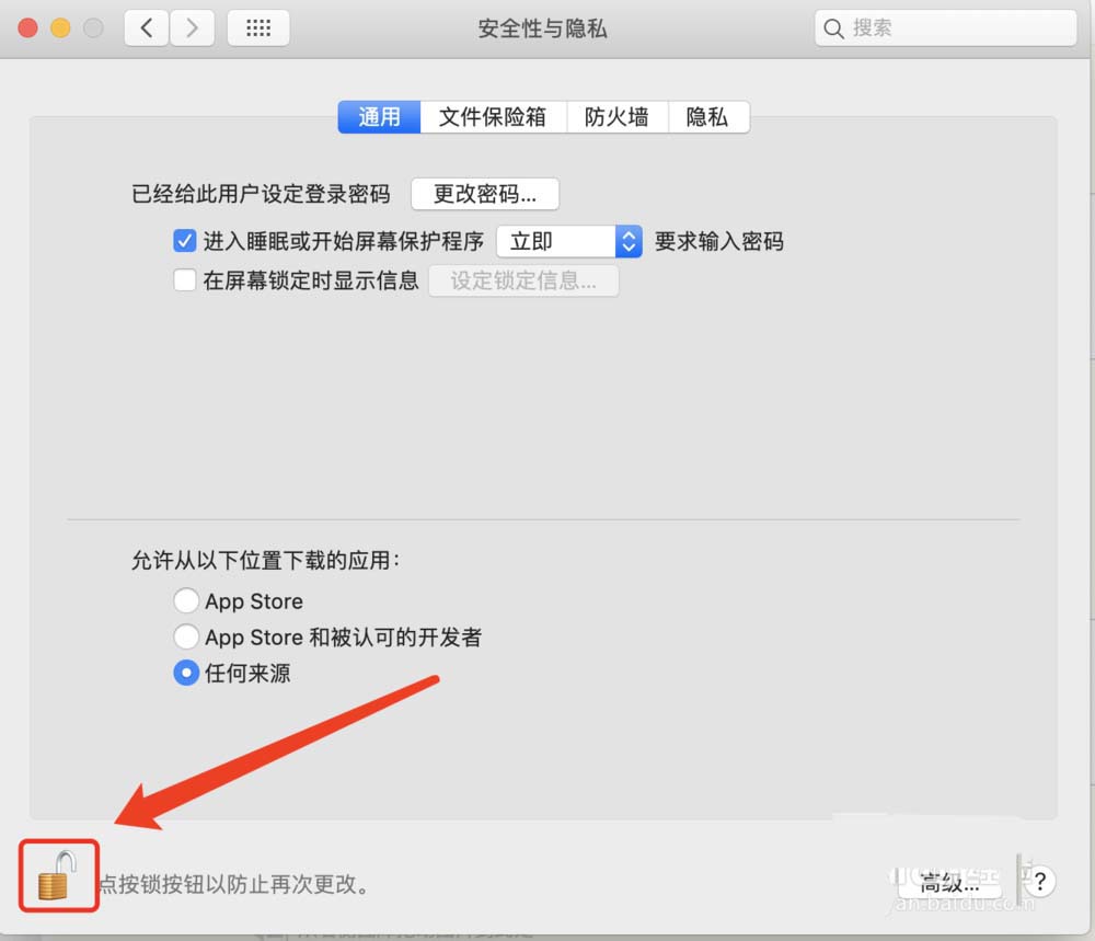 3、如果你的電腦開啟開啟了任何來源選項,那么在下圖處就會看到第3行的任何來源選項,如果沒有,就需要我們通過終端輸入指令來開啟