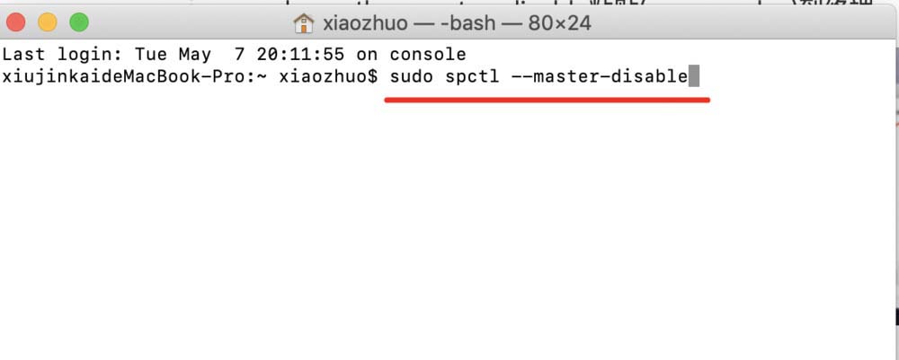 5、然后輸入sudo spctl --master-disable(直接復制黏貼),然后enter