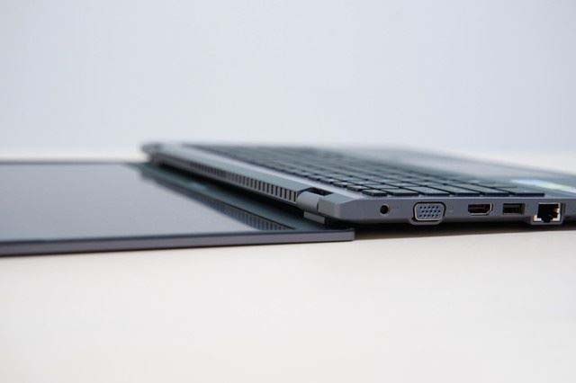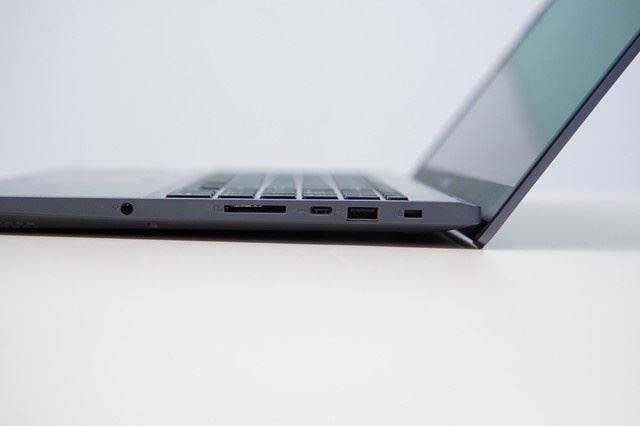 來到機身側面,可以明顯觀察到A面下部頂起整個機身的效果,這樣既有利于散熱,還能帶來一個比較舒適的打字角度右側接口方面,從左到右依次是,耳機麥克風一體接口,標準SD讀卡器,USB-C數據接口,USB 3.0接口,防盜鎖孔