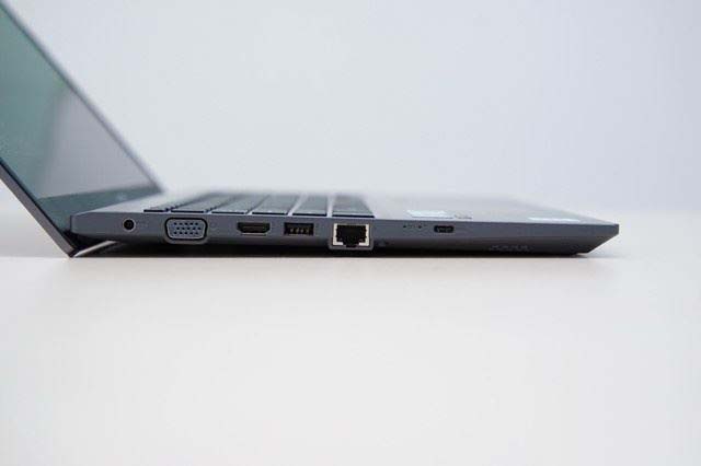 左側接口,從左到右依次是,電源接口,VGA,HDMI,USB 3.0,RJ45網線接口,電池指示燈,硬盤讀取指示燈,USB-C數據接口。不難發現,這臺華碩PX574F作為一臺商務本,配備了非常全面了接口,不但包含了VGA,還有網線接口以及標準SD讀卡器。可以說,使用這臺筆記本電腦,你完全不需要使用任何轉接器。