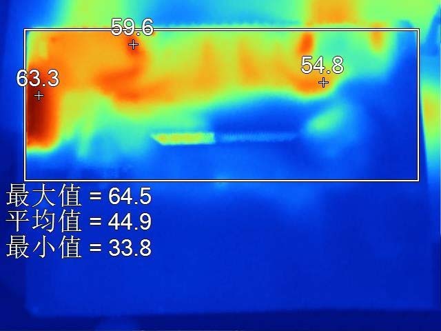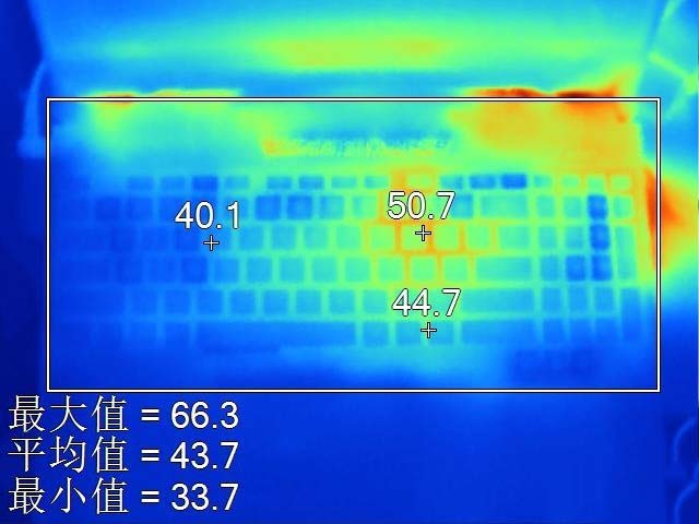 雖然核心溫度略高,但是華碩對(duì)飛行堡壘7的硬件做了比較合理化的排布,所以從熱成像來(lái)看,C面鍵盤(pán)區(qū)域平均溫度只有43.7℃,與用戶(hù)手掌部位相接觸的區(qū)域幾乎沒(méi)有發(fā)熱元件分布,所以整體的感覺(jué)還是比較舒適的。