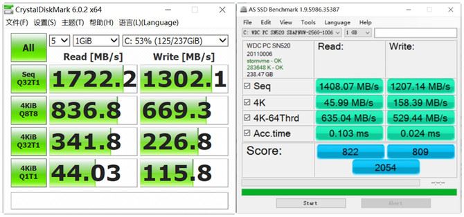 這款筆記本內置了256GB PCIe M.2固態硬盤,CrystaDiskMark檢測順序讀取速度為1722.2MB/s,寫入速度1302.1MB/s,AS SSD Benchmark讀取速度1408.07MB/s,寫入速度1207.14MB/s,雖然數據上略有差別,但是其綜合表現還是很不錯的,屬于中等偏上的水平,copy較大文件時其速度也是很快的。如果覺得256GB固態容量小,大家可以選配雙硬盤款,或者自行升級更大容量的硬盤。