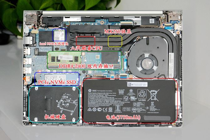 全新的惠普戰66二代在硬件上最大的變化就是配置了“滿血”MX250顯卡,我們拿到的這款筆記本還搭載了英特爾八代酷睿i5-8265U處理器,8GB 內存,PCIe M.2 256GB的固態硬盤。通過下面的拆解圖大家也可以看到,這款筆記本支持雙內存插口、雙硬盤設計,所以其擴展性也算是非常強大的。